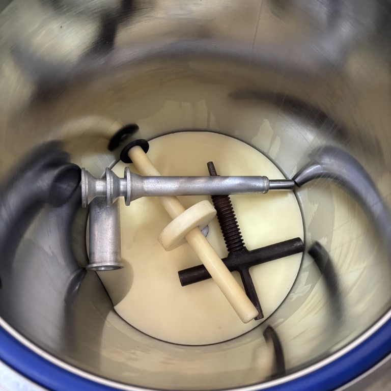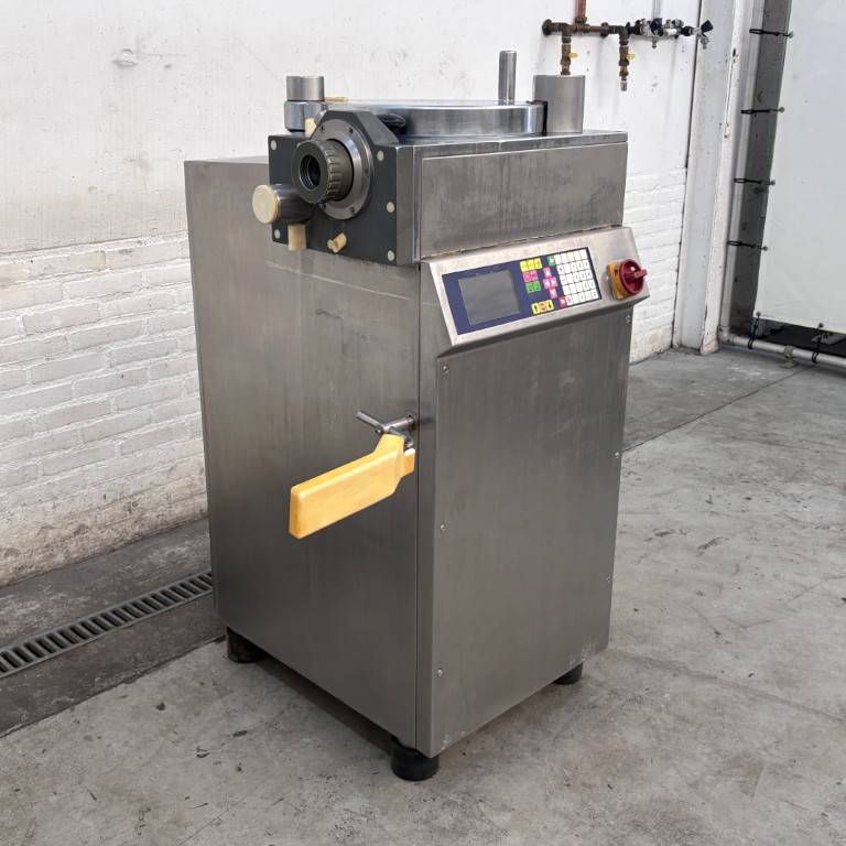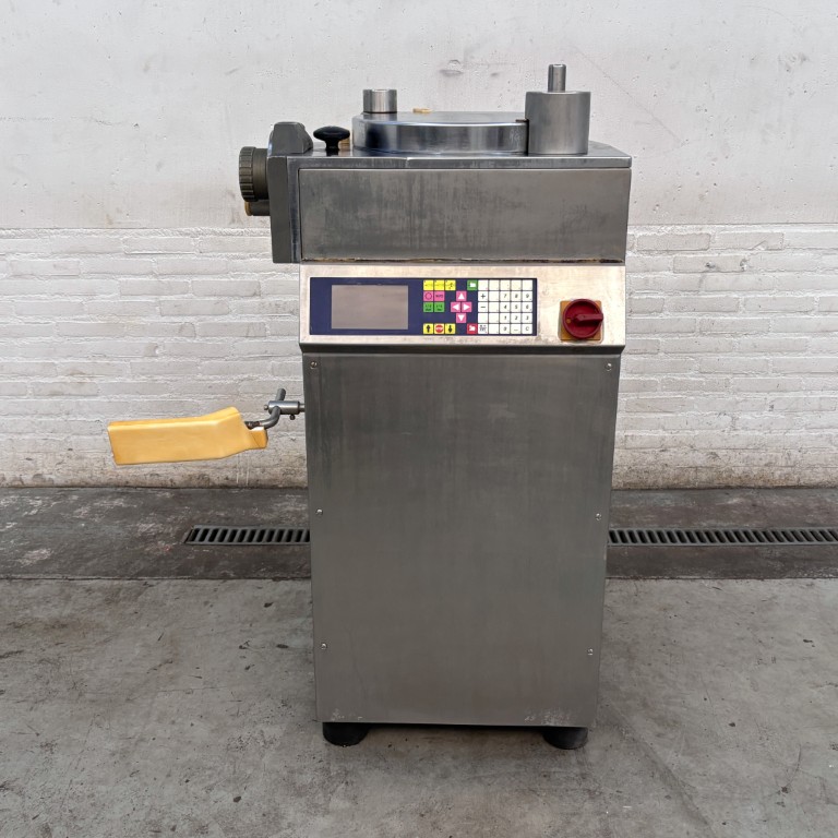 Używana nadziewarka hydrauliczna Frey Kompakta 2‑40 to profesjonalne urządzenie do automatycznego napełniania kiełbas o pojemności 40 L, z prostym, elektronicznym sterowaniem i możliwością porcjowania od 5 g do 10 000 g. Gwarantuje równomierne napełnianie.